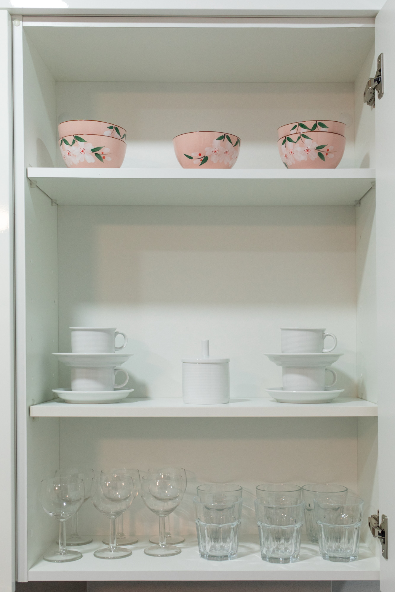 Adjacent to the kitchen is the laundry room with washing machine, tumble dryer, ironing board and plant, where cleaning supplies and products are also stored.
