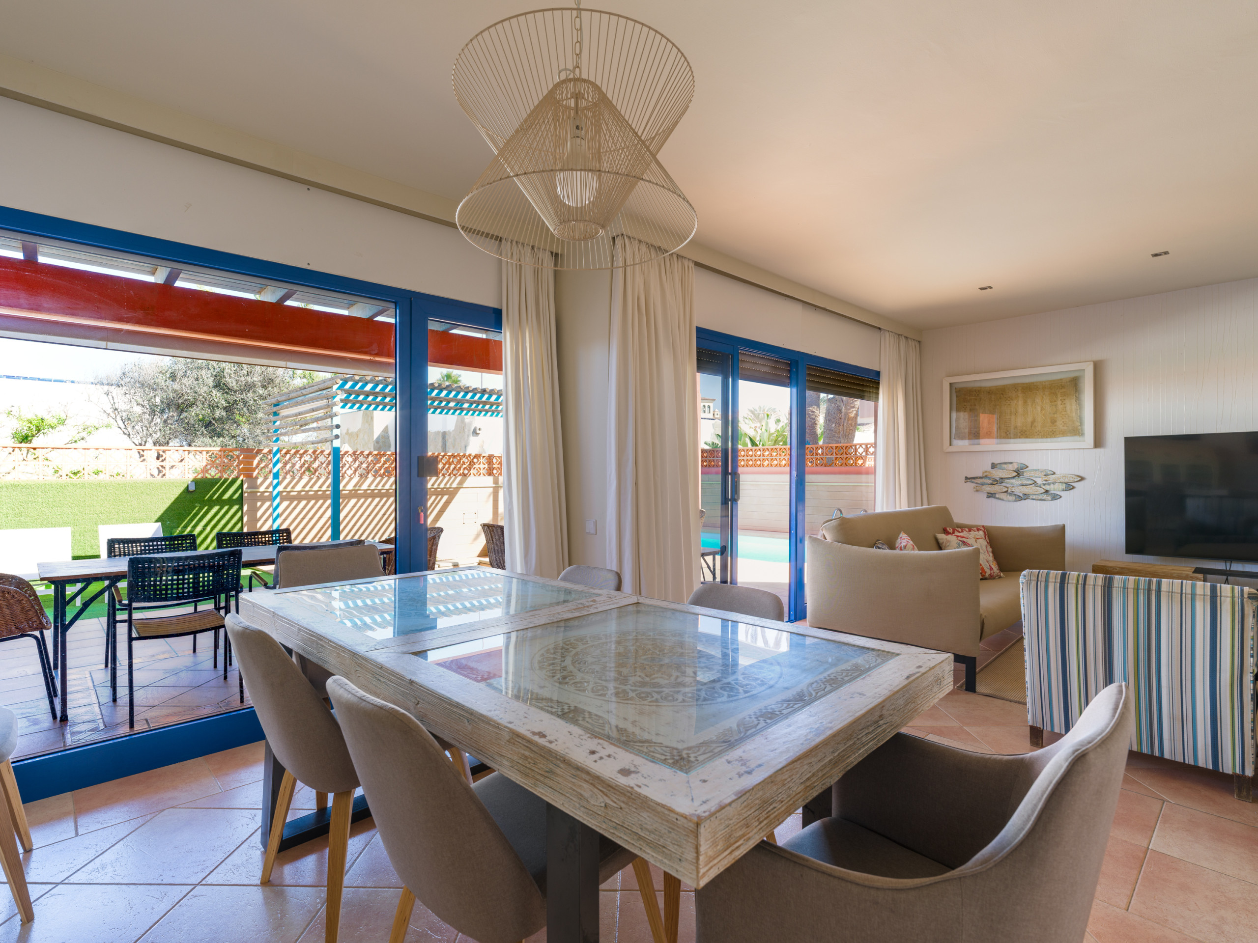 La estancia ha sido formidable. La casa está muy bien preparada. Bien equipada. Espaciosa. La piscina muy agradable con los flotadores. El viento constante es muy agradable. Los ventiladores de las habitaciones hacen un buen servicio. El servicio de limpieza es buenísimo, rápido y eficaz. Y estás a un paso de las dunas y del centro del pueblo. Gracias