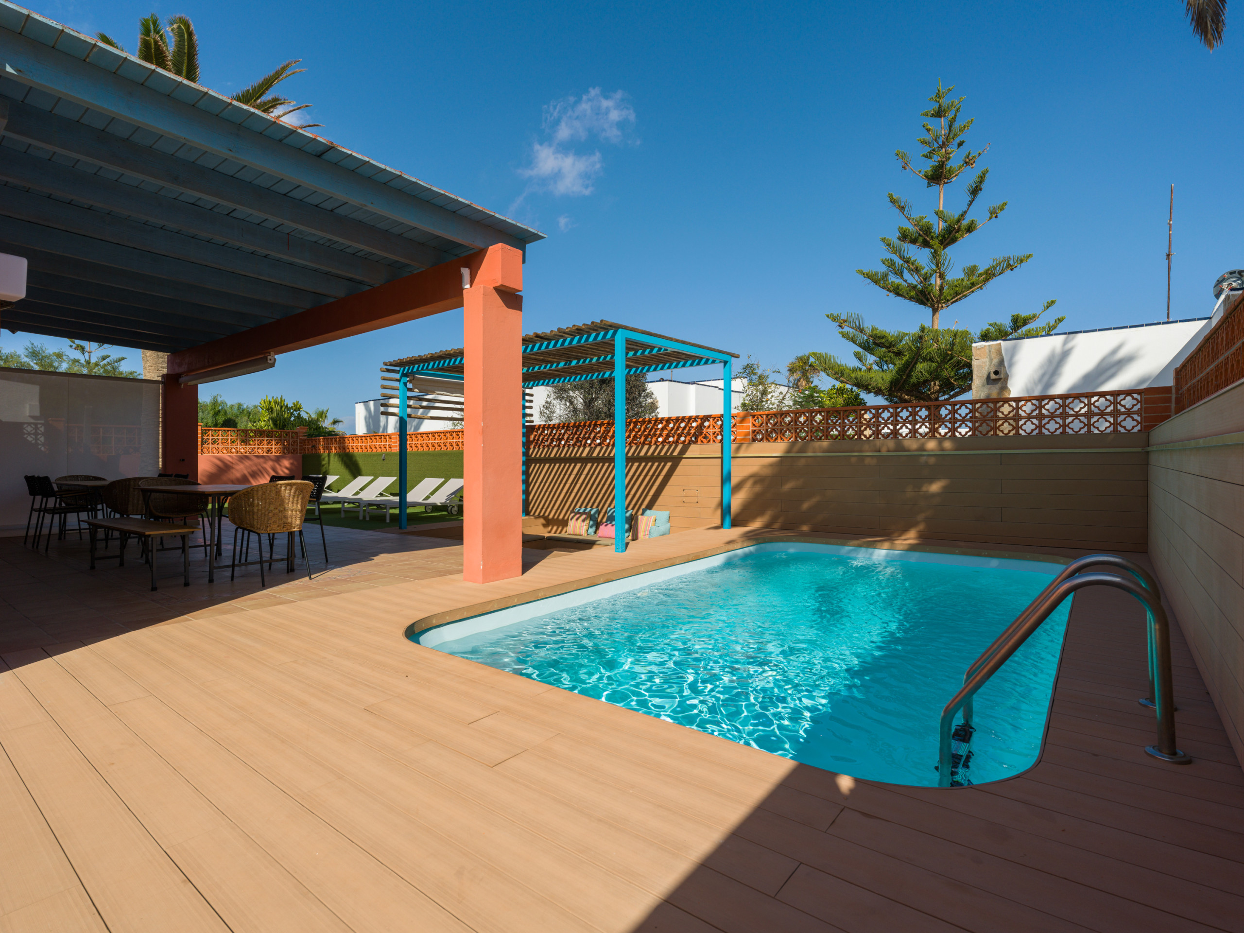 Struttura bellissima, ben servita, rifinita e accogliente su 2 piani con giardino, barbecue , chillout, posto auto e piscina! Posizione centrale a Corralejo!