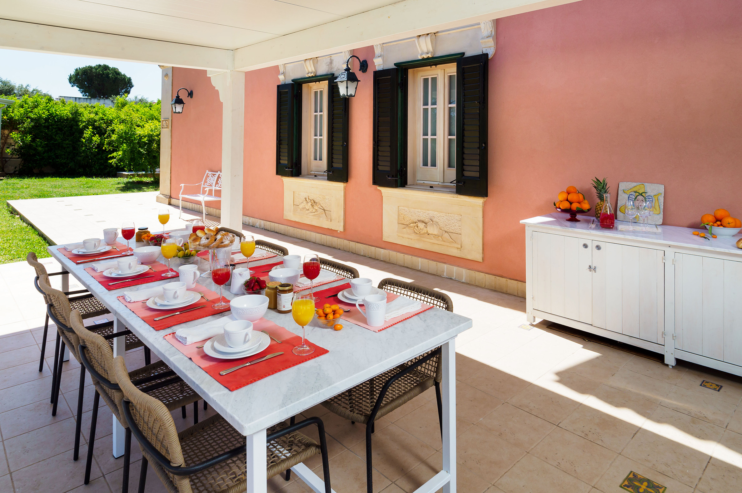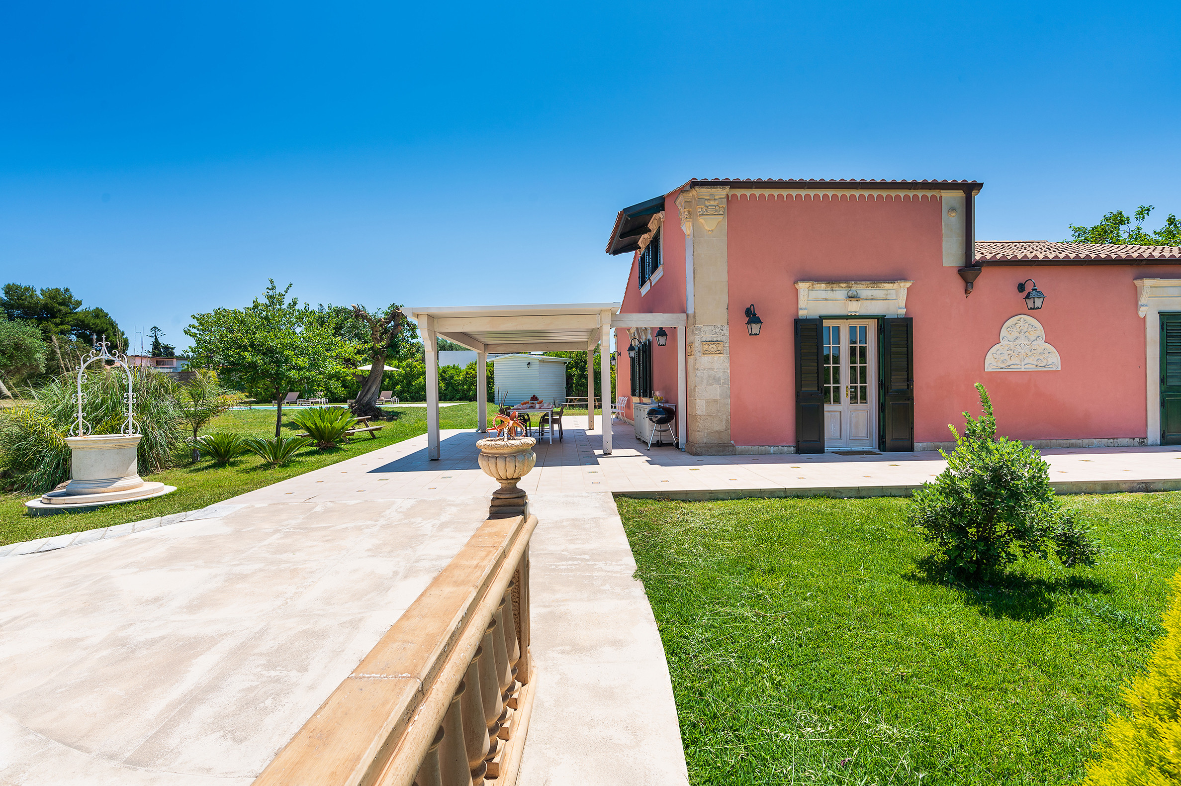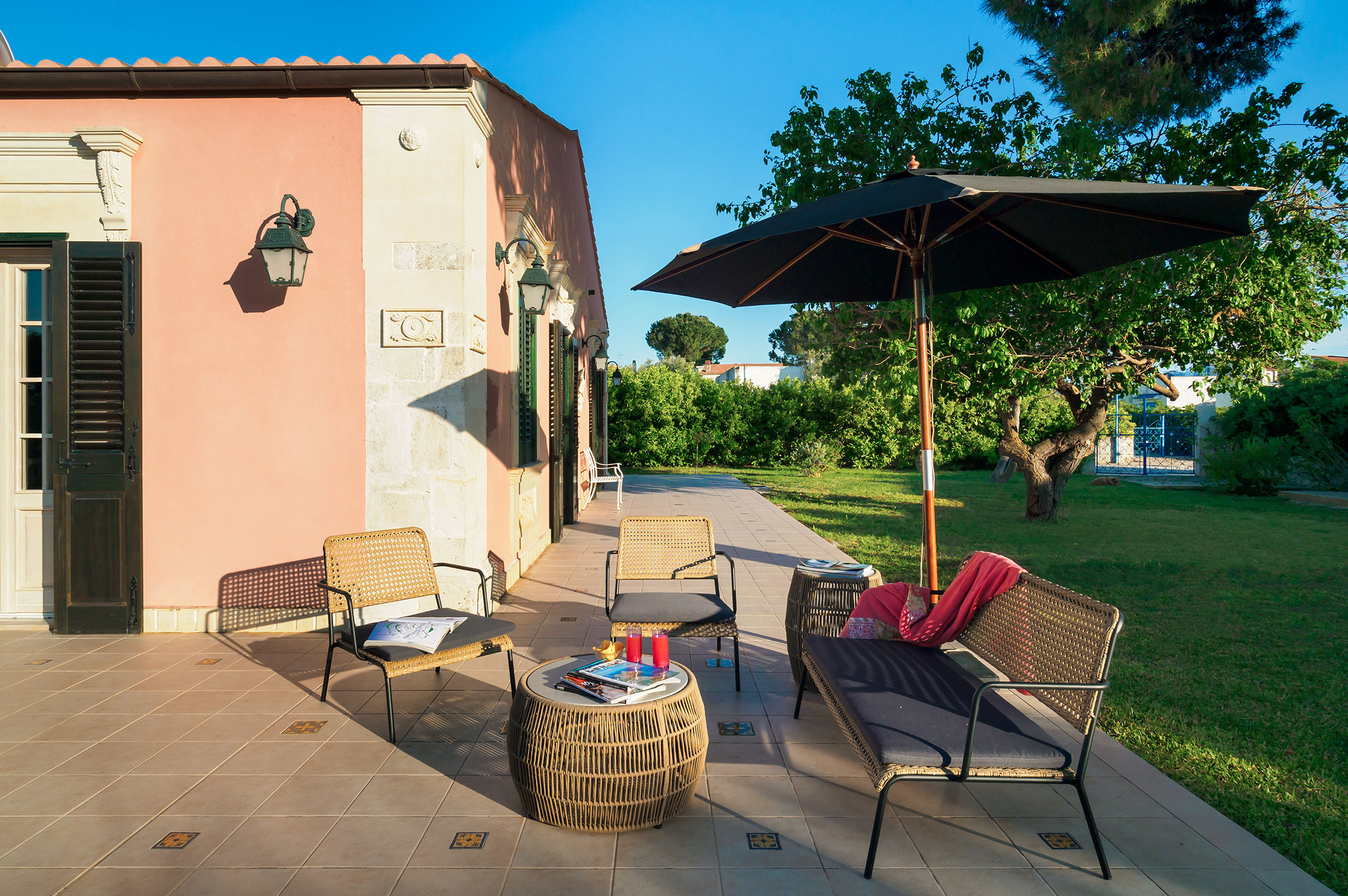 Gira Sole is a beautiful villa with private pool situated just a stone’s throw away from Fontane Bianche’s lovely sandy beach, a popular seaside resort south of Syracuse. Ideal property for those seeking sun, sea and relaxation, the villa is surrounded by a spacious, manicured garden with large, well-equipped terraces, which are the perfect spots for outdoor living. Its cosy interior, tastefully decorated mixing modern and antique furniture, includes on the ground floor a large living/dining room, a fitted kitchen, three comfortable bedrooms and two bathrooms. From the living room a solid wood staircase leads to the first floor, which contains the fourth bedroom and the third bathroom. The villa comes also with air conditioning, wi-fi, 2 TVs, washing machine, dishwasher and external shower. The location of Gira Sole, besides being practical for reaching on foot the beach and the sea, is convenient for visiting eastern Sicily’s most beautiful towns such as Syracuse, Noto, Modica, Ragusa Ibla, Scicli, Vendicari’s nature reserve, the fishing villages of Portopalo and Marzamemi, but also Taormina and Mount Etna.