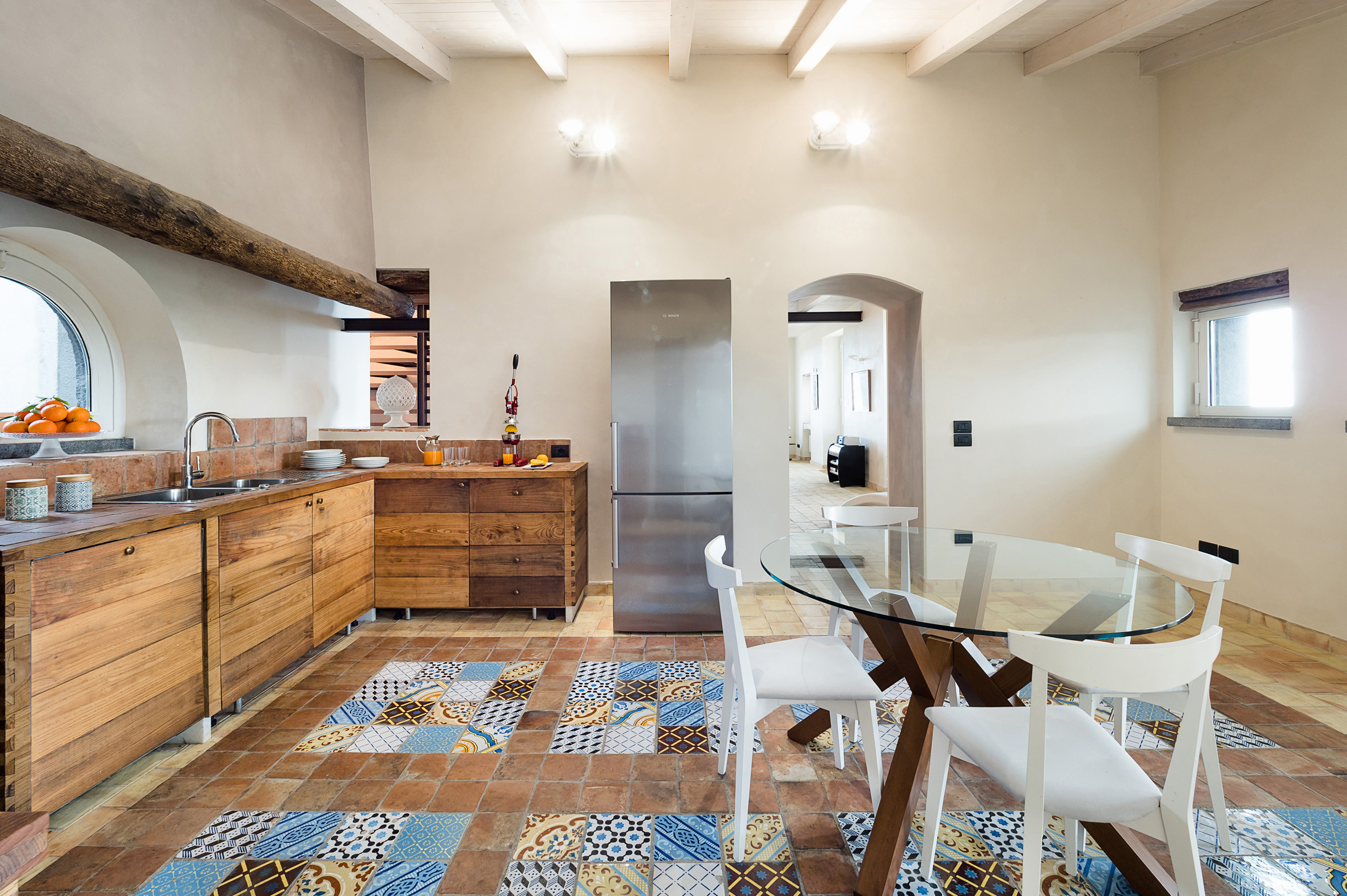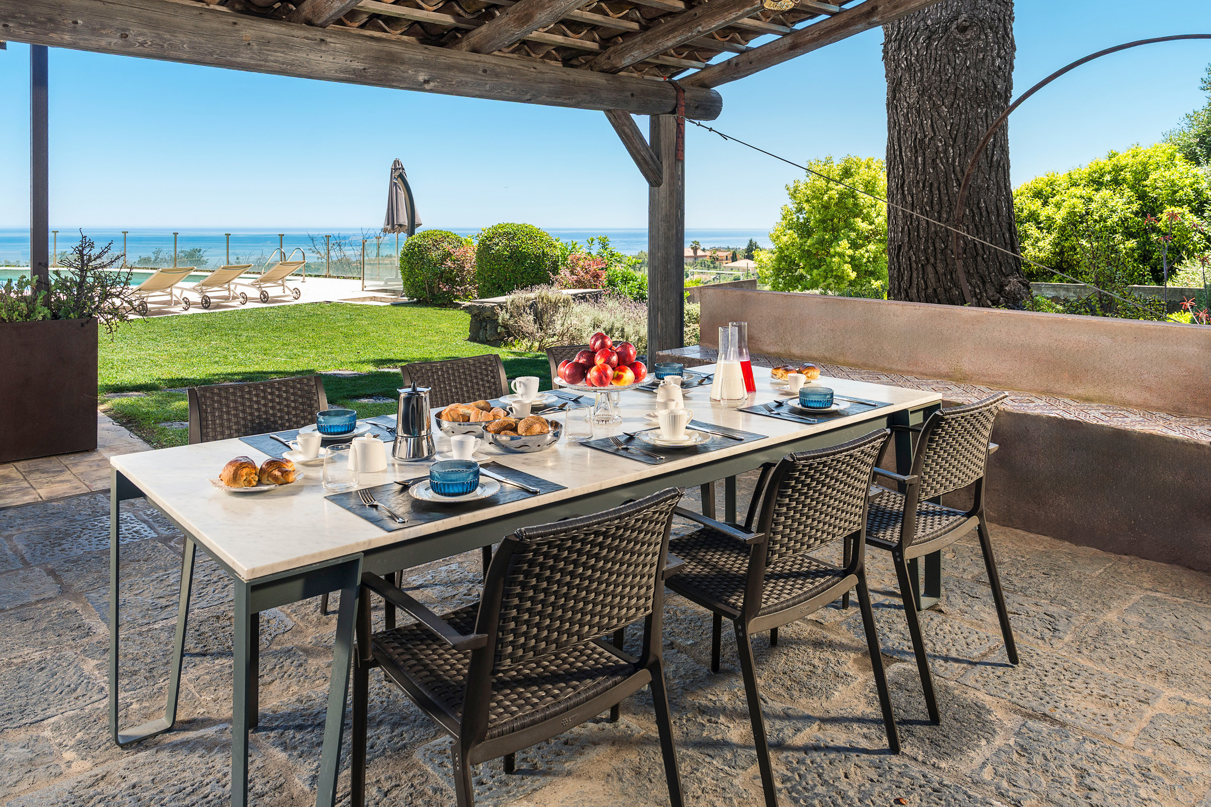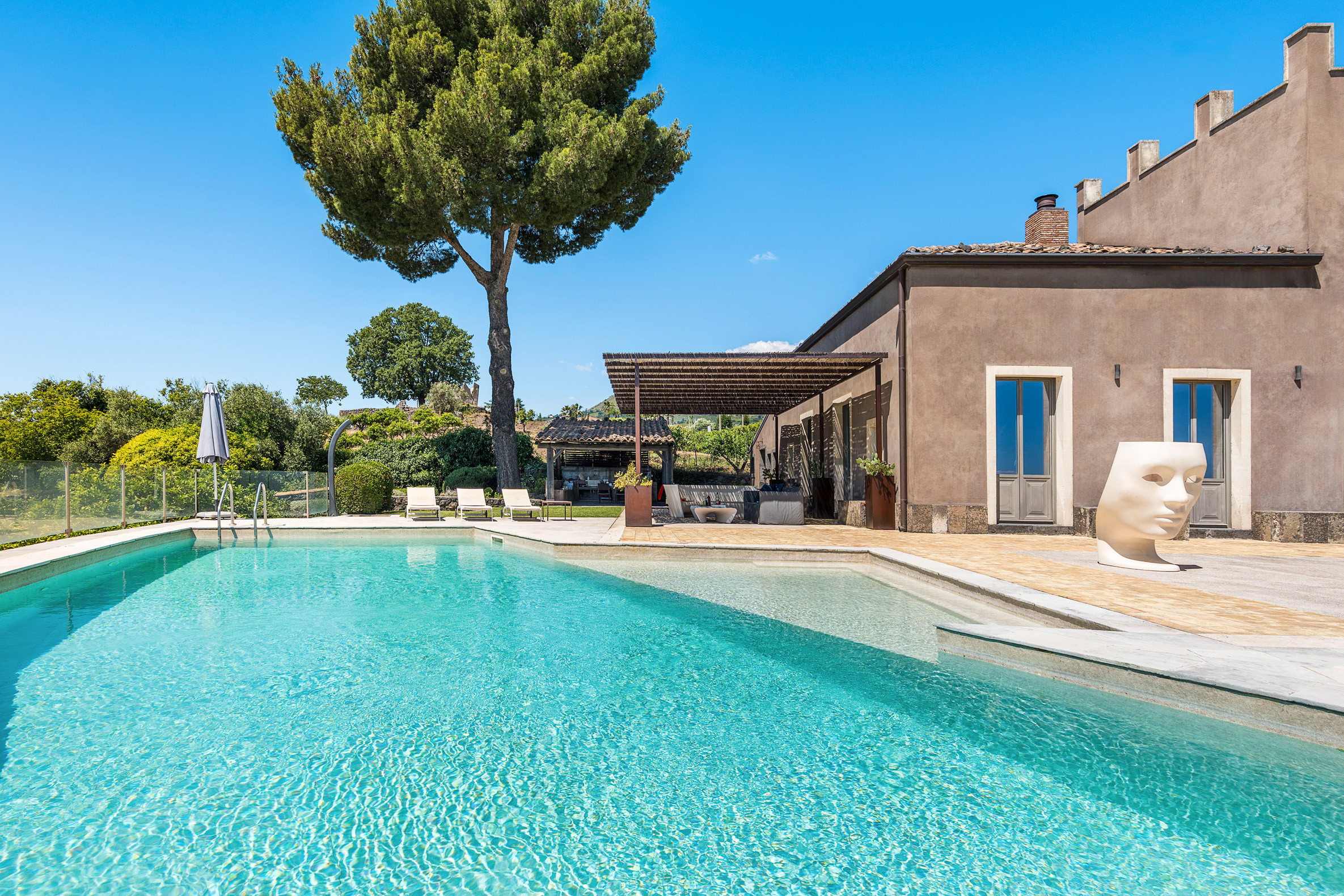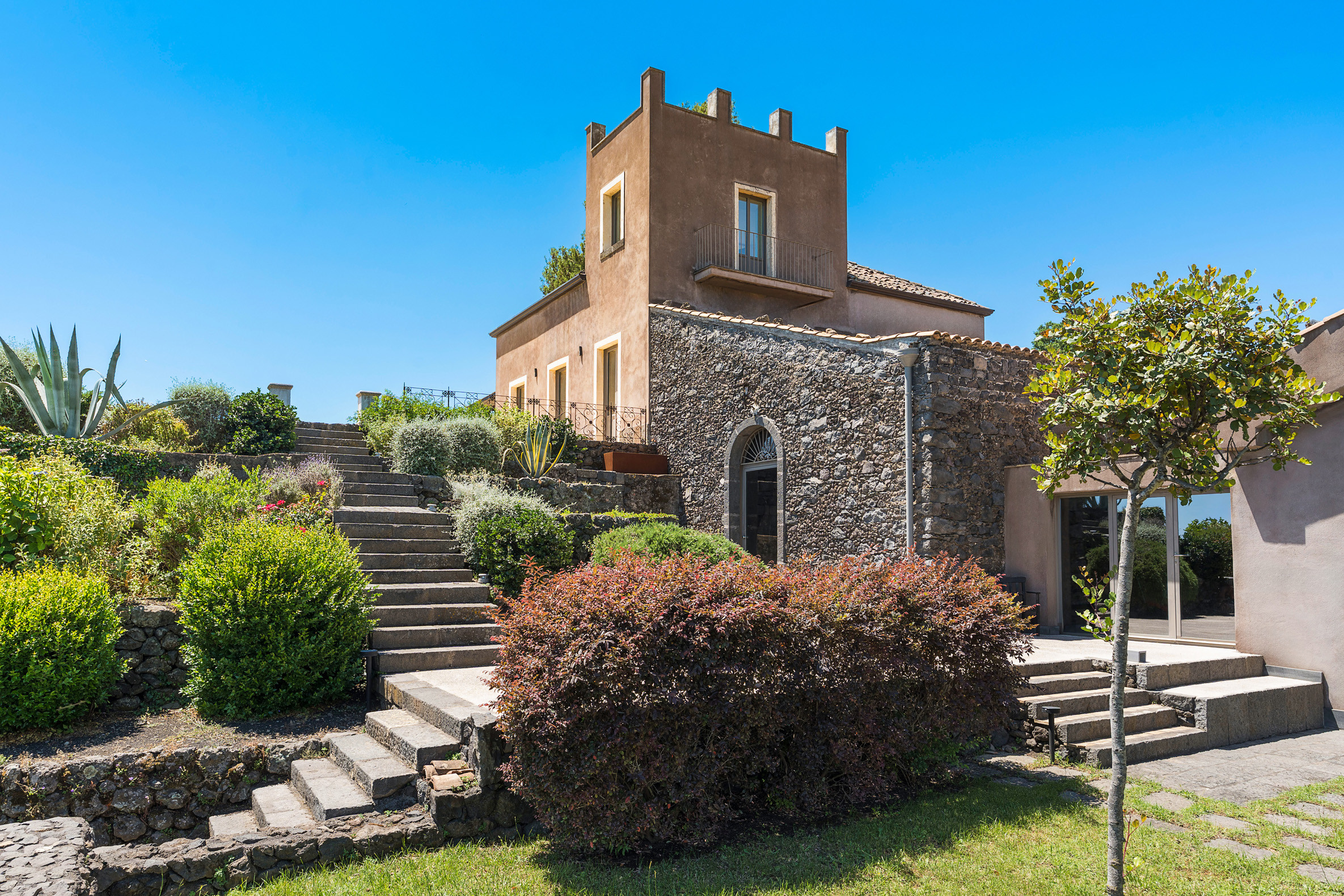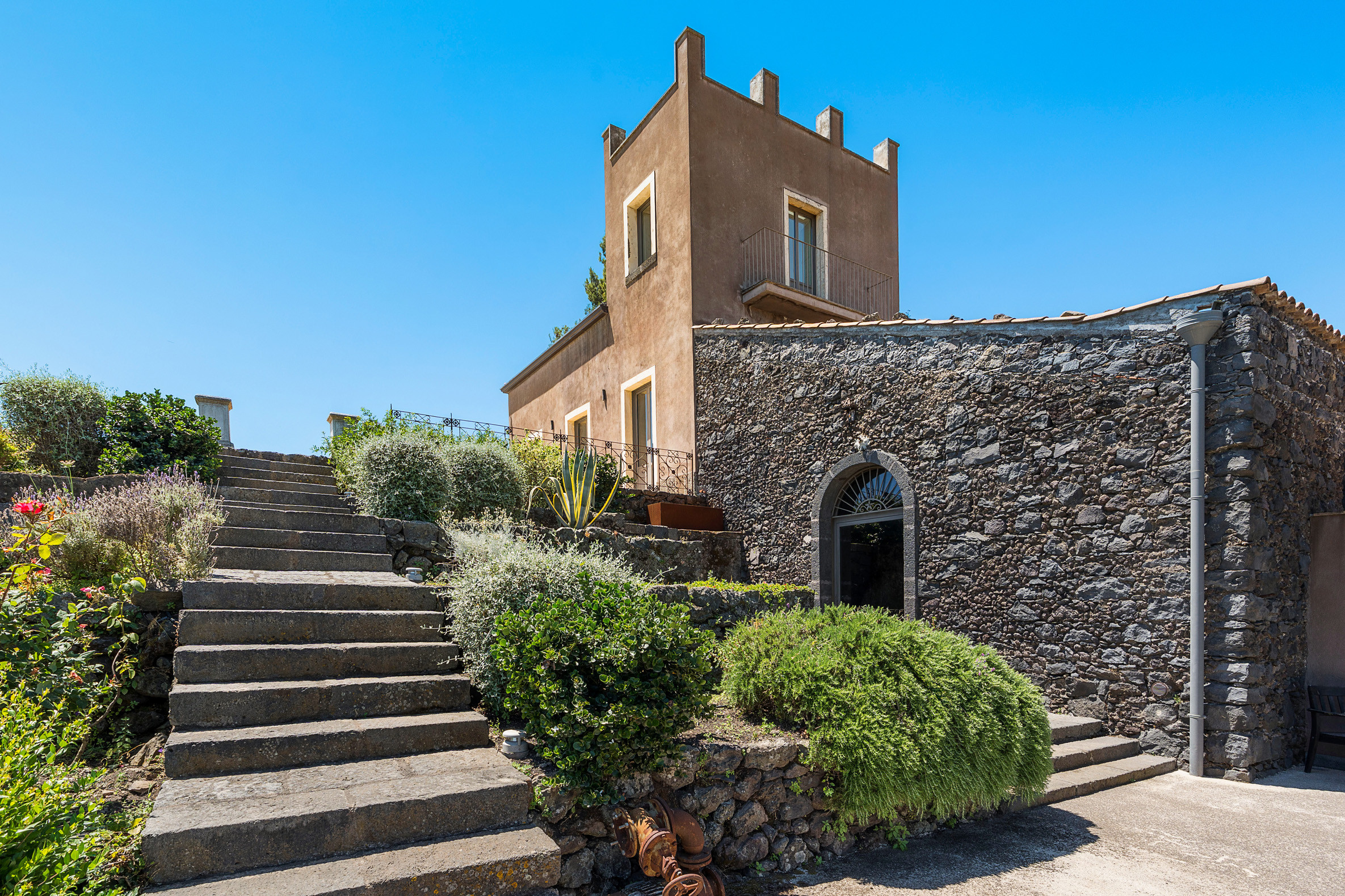 An exclusive, refined property set on the slopes of Mount Etna, near Zafferana Etna. La Torretta is an old rural farmhouse which has recently been restored and converted into a fabulous private residence. Framed by Mount Etna’s unique natural environment with its vineyards, orchards and low stone walls, the property boasts an amazing saltwater pool with panoramic views, large and well-equipped terraces, a lovely garden with aromatic plants and a beautiful spa area with Jacuzzi, Turkish bath, sauna, multi-sensory shower and salt grotto. Its cosy interiors, furnished with great care and attention to detail, occupy what were once the manor house, the winery, the stable and the storage room. Renovated using eco-friendly materials, they still retain their character and original architectural features. Combining modern features with traditional elements, these stylish interiors include, on the ground floor of the manor house, a living area with lounge, dining room, kitchen and guest bathroom. On the first floor are three bedrooms with en-suite bathrooms and on the lower floor, in the former wine press room, is the wellness area. in the annexe Casetta there are a suite with double bed in the loft with en-suite bathroom. The outdoor area also includes a kitchen with dining area and a small football pitch. The villa is equipped with gym room, air conditioning, Wi-Fi, washing machine, dishwasher, heating and fireplace. From the villa can be easily reached the other villages and natural beauties of the Etna Park and the most popular towns on the Ionian coast, such as Taormina, Catania and Syracuse.