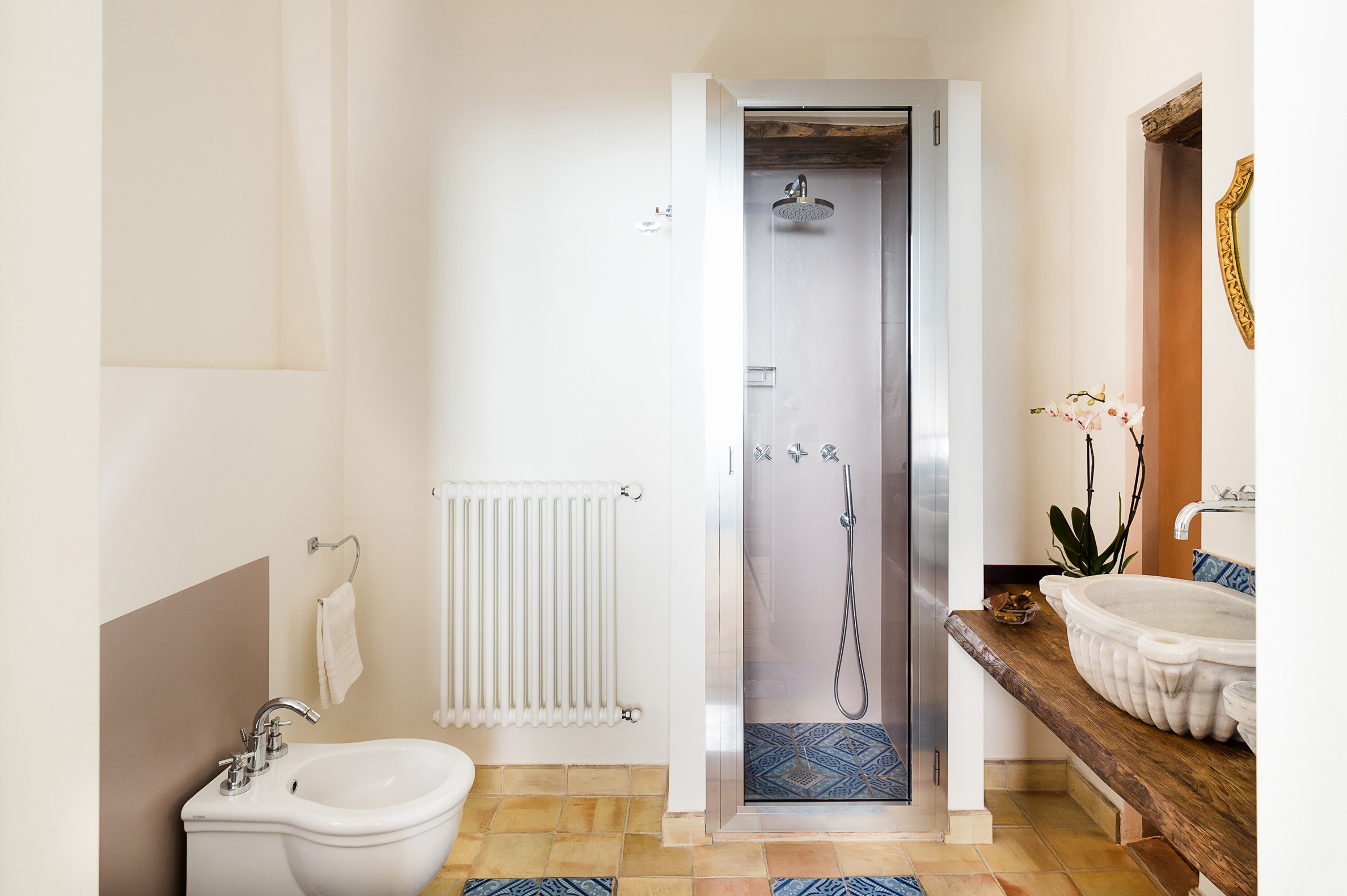 MANOR HOUSE Ground Floor: living room with fireplace, dining room, kitchen, 1 bathroom, laundry room. First Floor: 1 double bedroom with en-suite tub and shower, 1 twin/double bedroom with en-suite shower, 1 single bedroom with en-suite shower. Lower Floor: wellness area with Jacuzzi, salt grotto, sauna, Turkish bath, multi-sensory shower, fireplace, relaxing area.